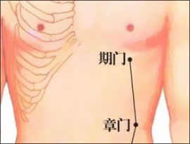 期门穴,在第6肋间隙中,有健脾疏肝、理气活血的作用。它一方面疏解肝气,对于爱生闷气的人有缓解情绪抑郁的作用,它同时还能缓解因为肝气不疏导致的胃气不降,因此还能调理消化不良。